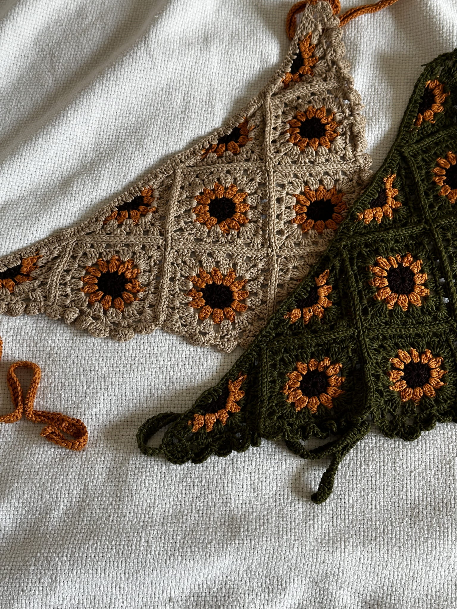 Sunflower motif in a granny square style, finished with a cute ruffle and tie straps