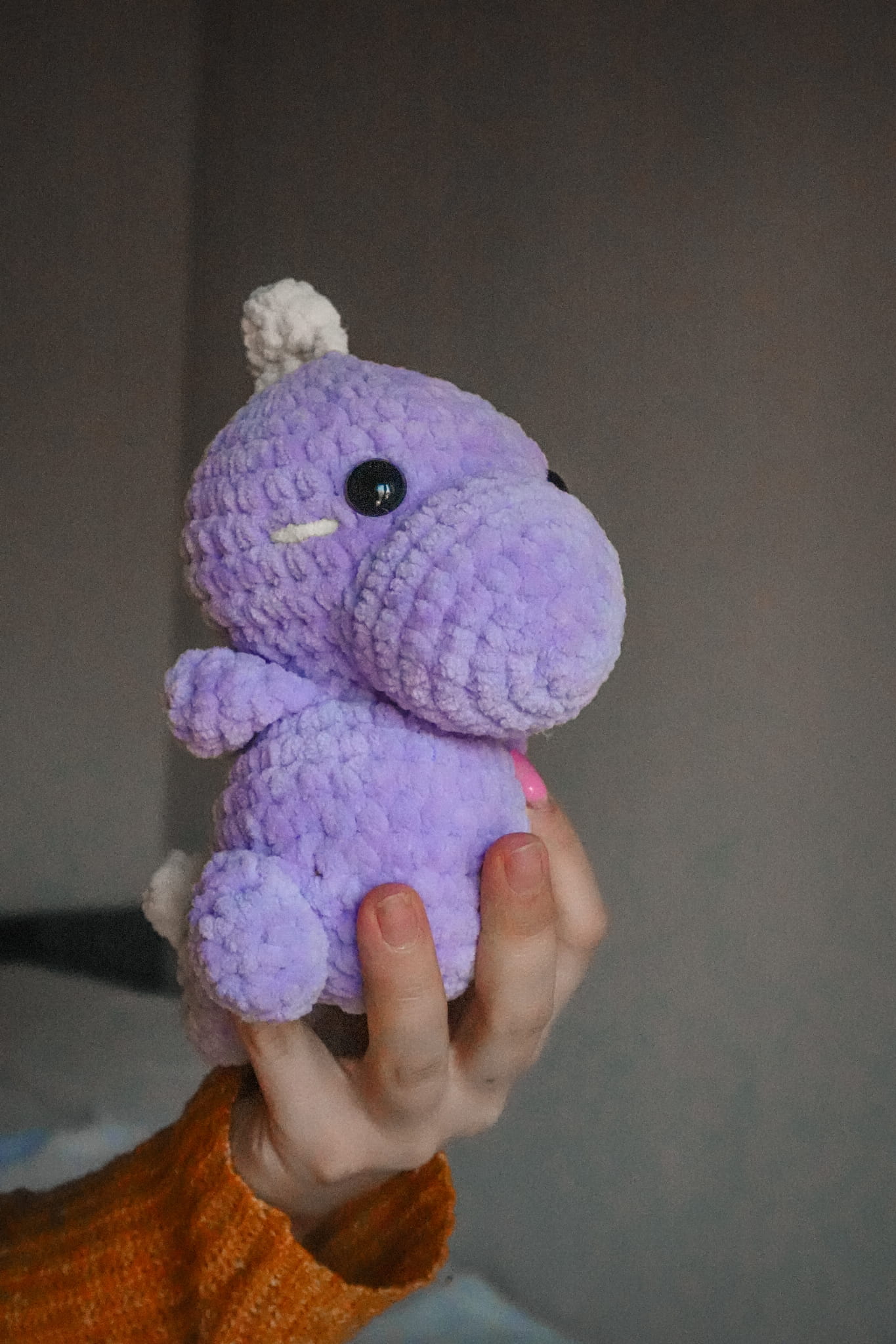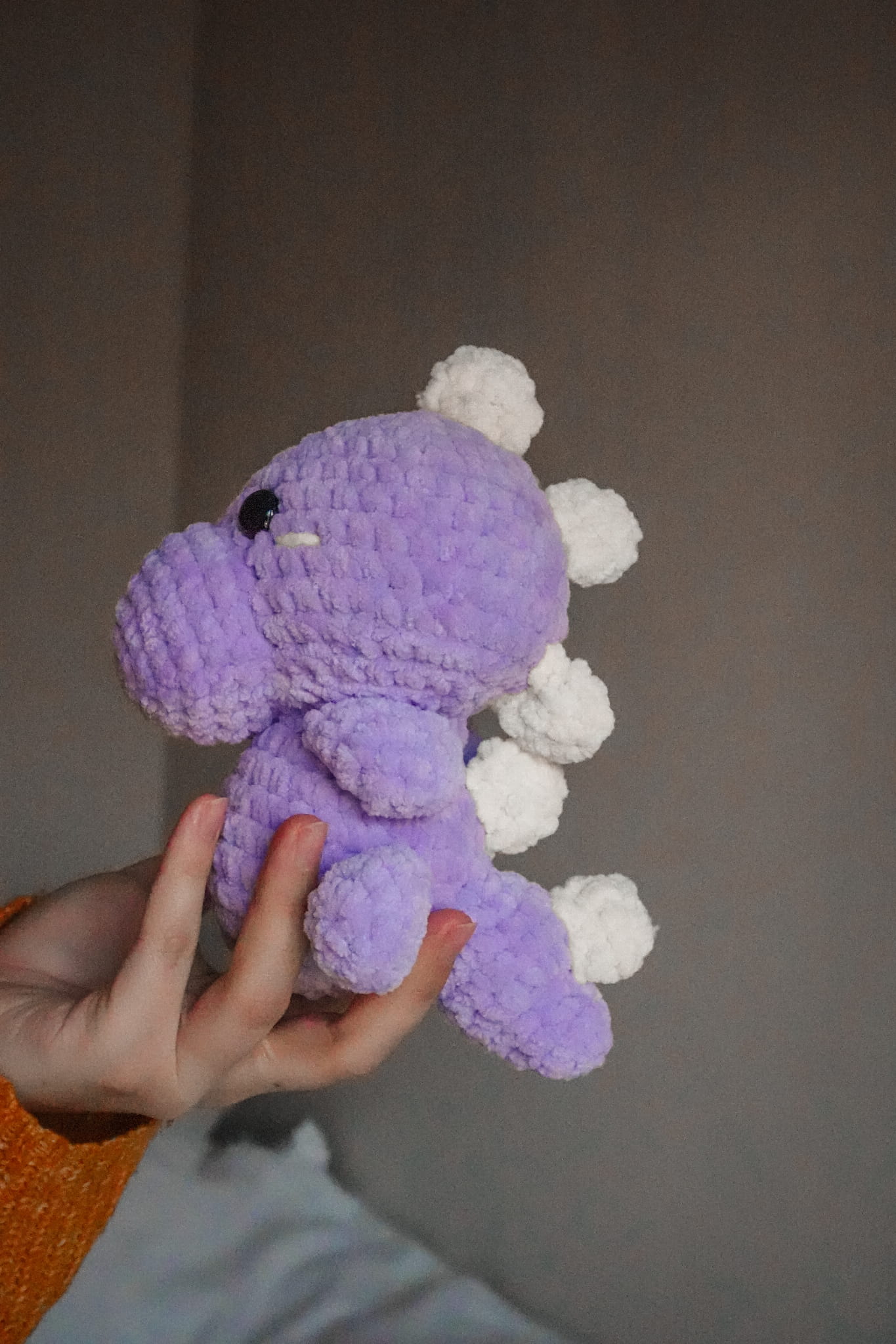 Meet our adorable dinosaur – handmade with love using soft, plush yarn. This little purple buddy stands around 17 cm tall and is crafted with attention to every detail – from the safety eyes to the cute tail and tiny arms.