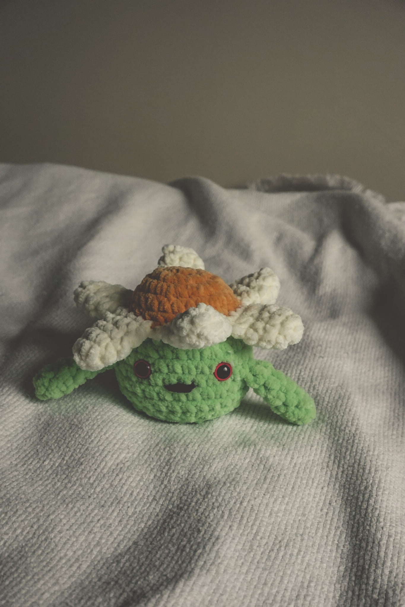 A cheerful, handmade flower plushie with a smiley face. Made from soft, plush yarn, this adorable toy is perfect for cuddles, playtime, or as a charming nursery decoration.