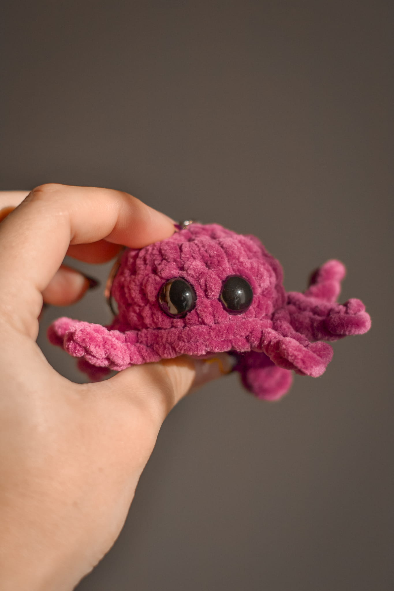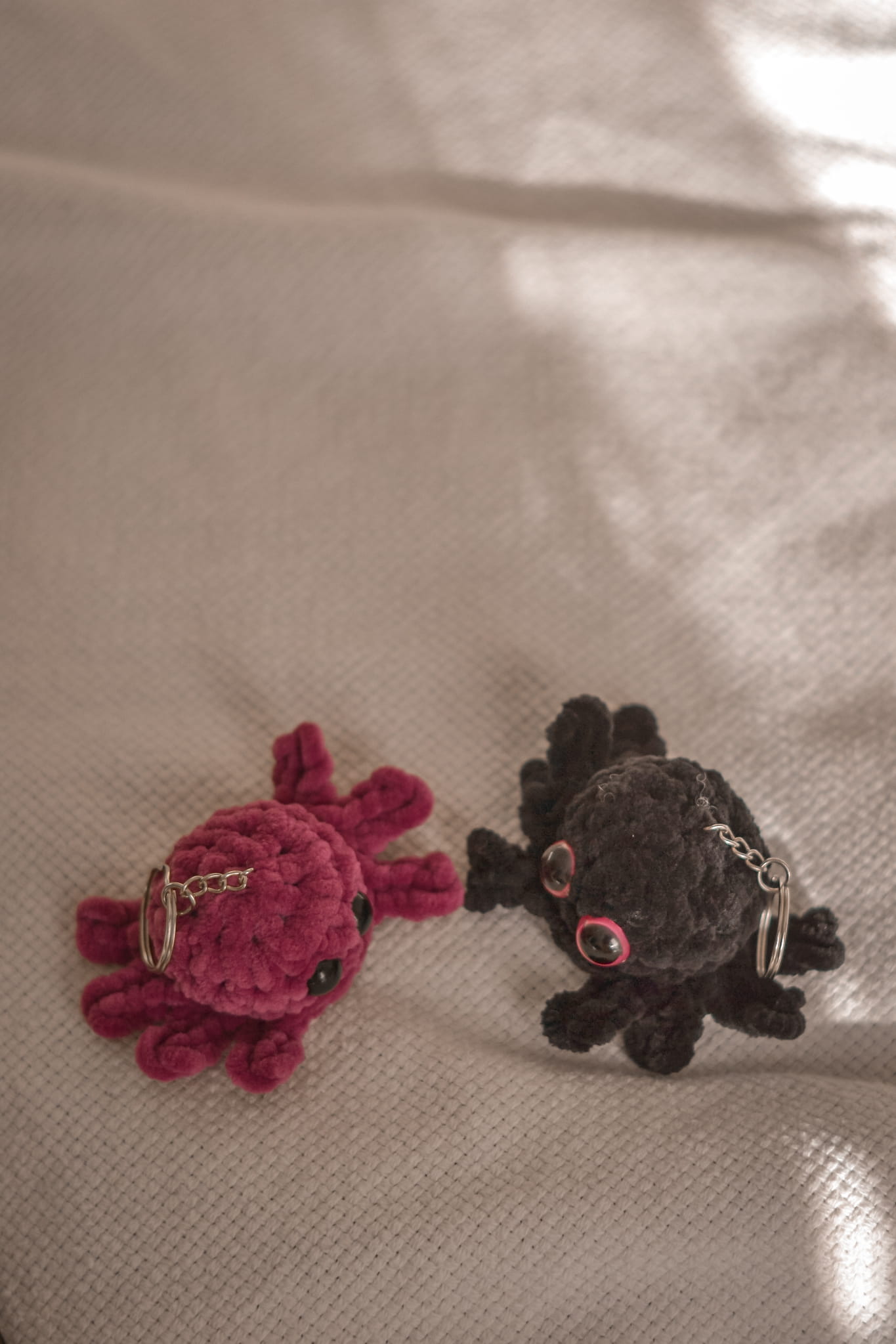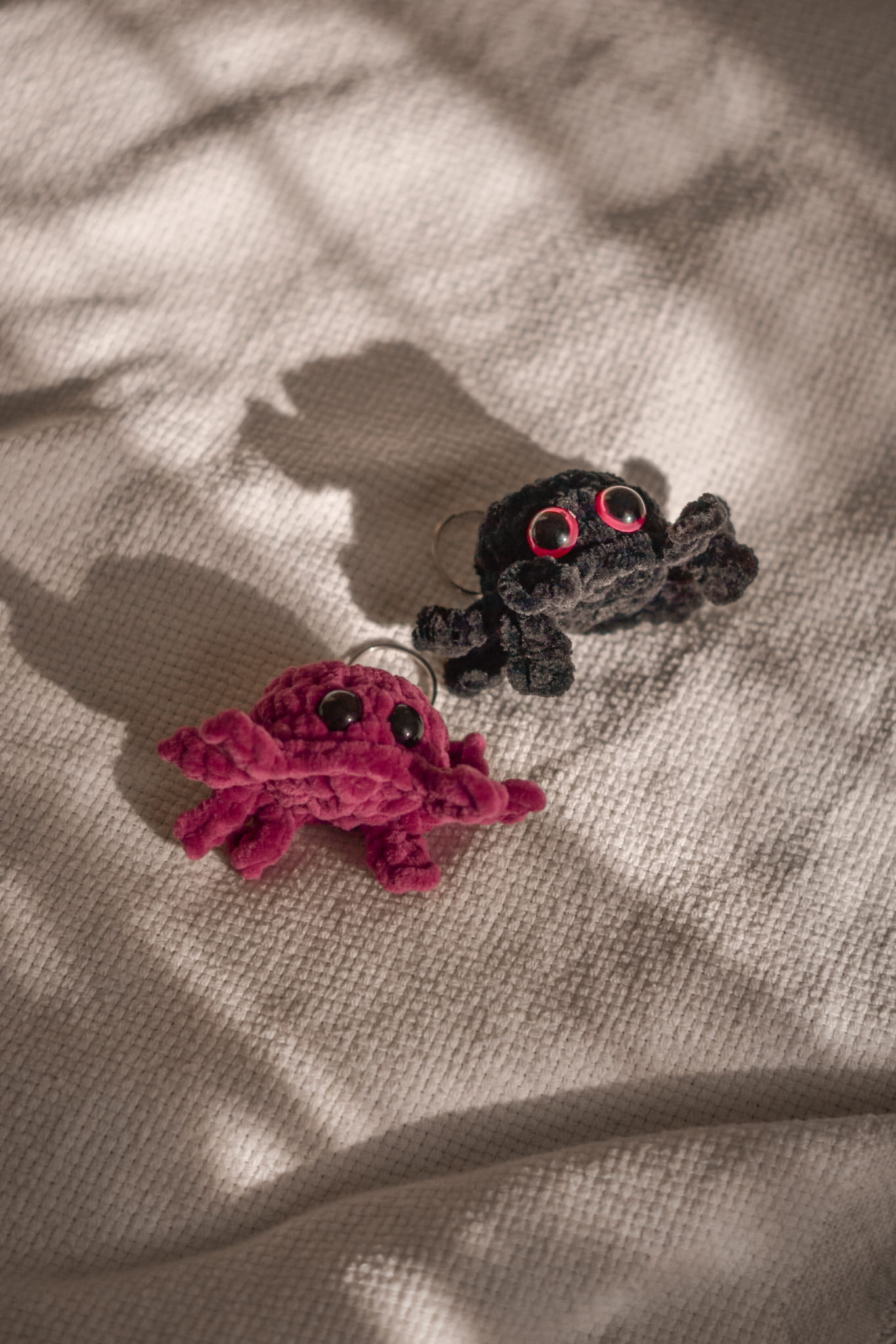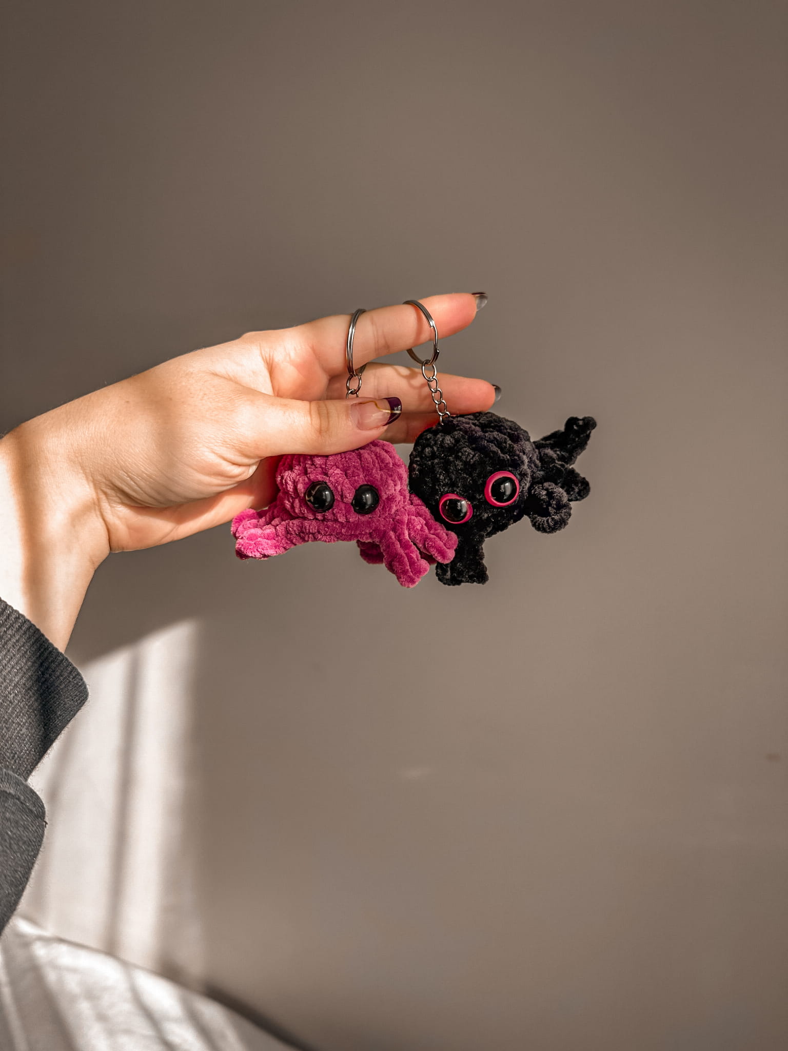 This adorable spider-shaped keychain is a unique and playful accessory for your keys, bag, or backpack. Handcrafted from soft plush yarn, it stands out for its detailed craftsmanship and charming design. The spider is available in two color options: vibrant pink and classic black, making it a perfect choice for lovers of both bright and subtle accessories.