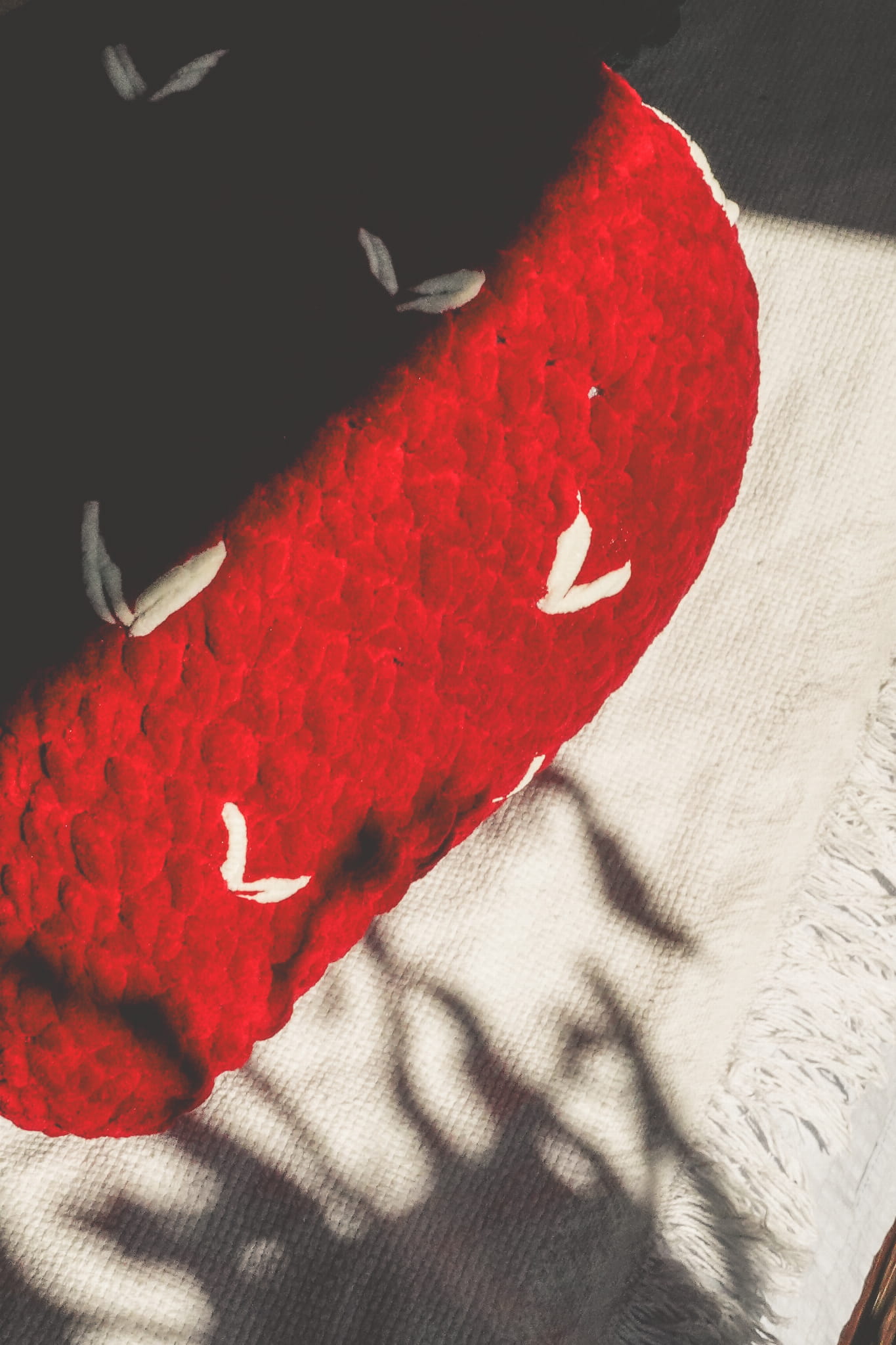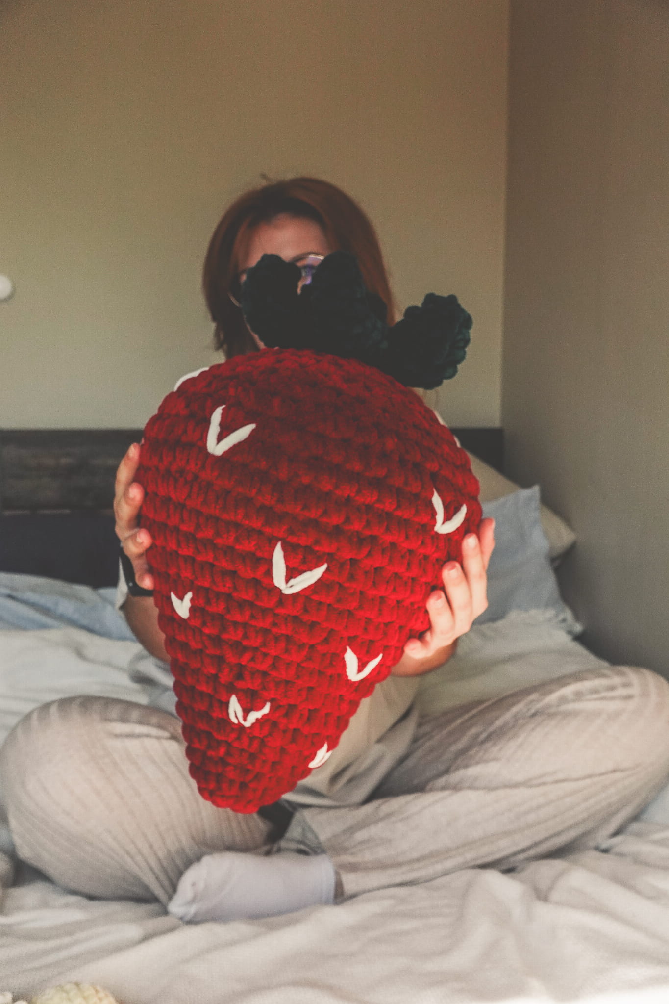 A strawberry-shaped pillow, handmade with soft, plush yarn using crochet technique. This cozy and eye-catching piece is perfect for a children’s room, a warm living space, or as a gift for lovers of handmade decor.