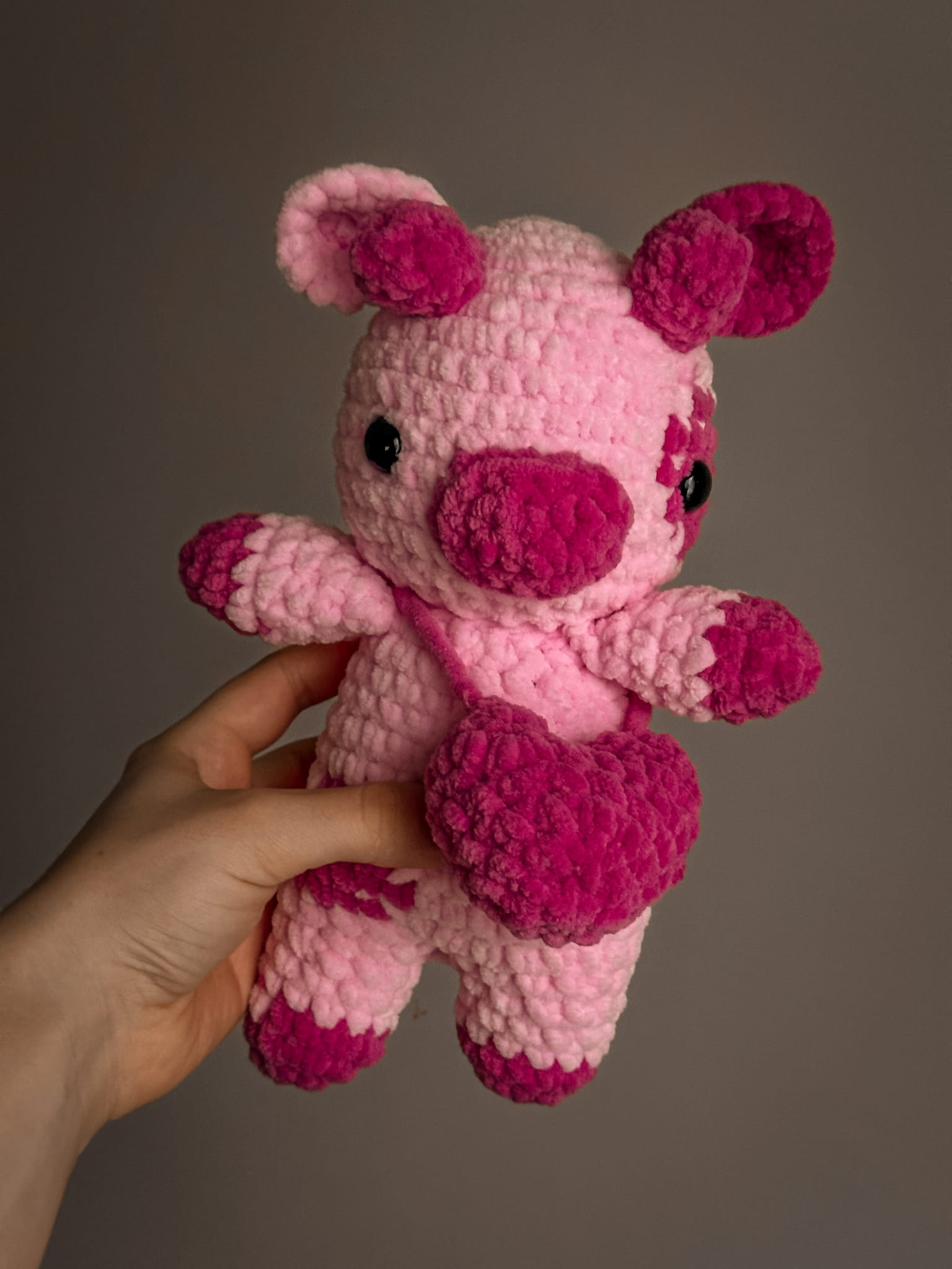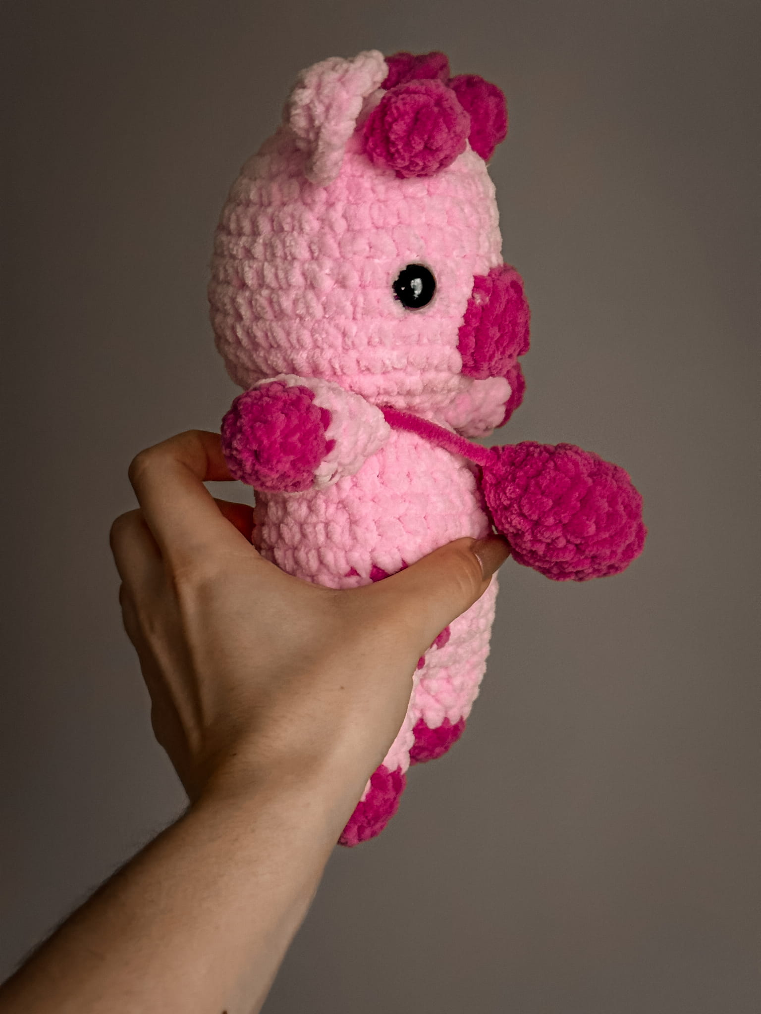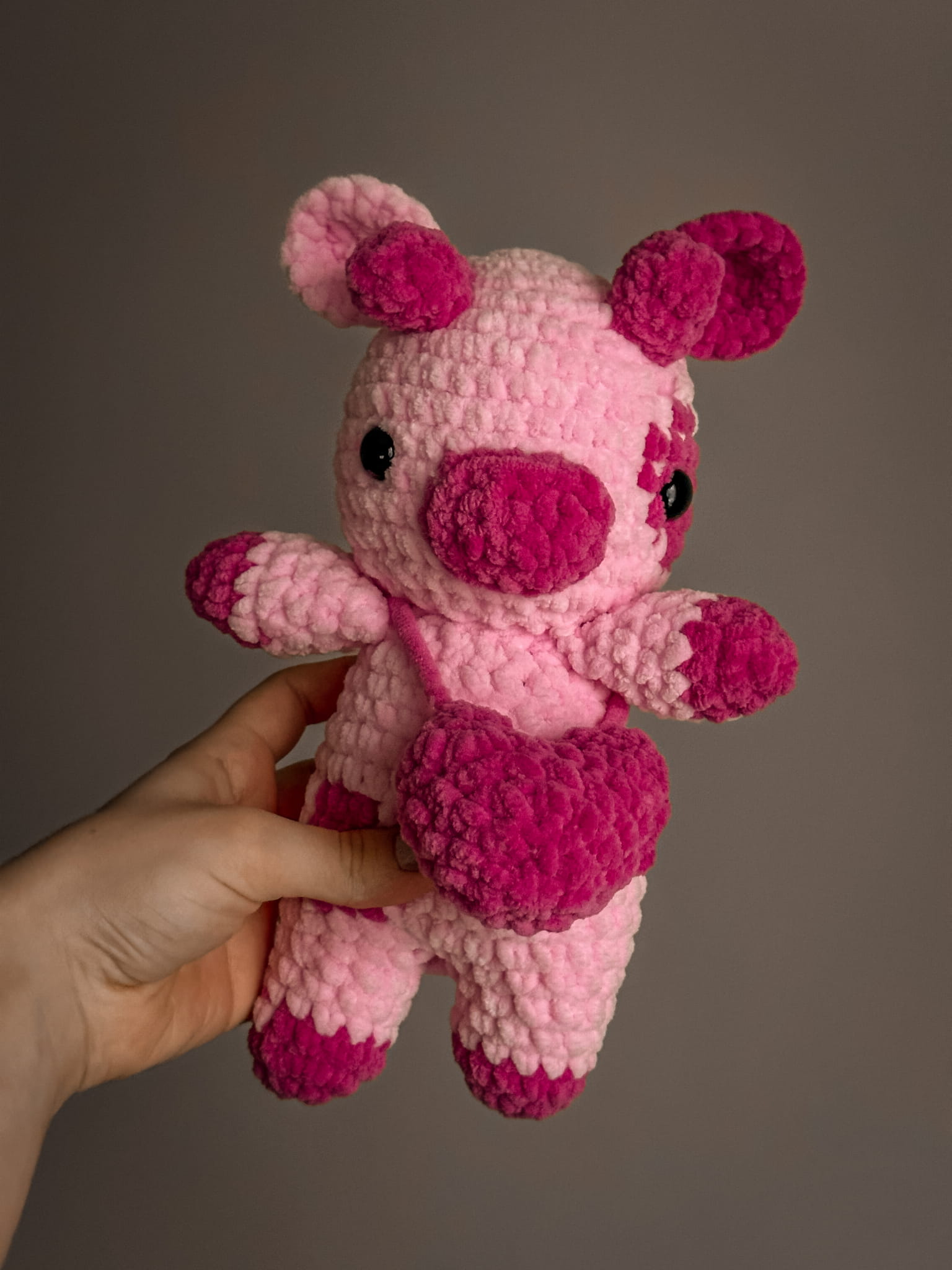 Meet this adorable crochet plush toy in the shape of a pink animal! Perfect as a decoration, a companion for little ones, or a unique gift for someone special. This handmade plush combines softness and charm, adding a touch of magic to any space.