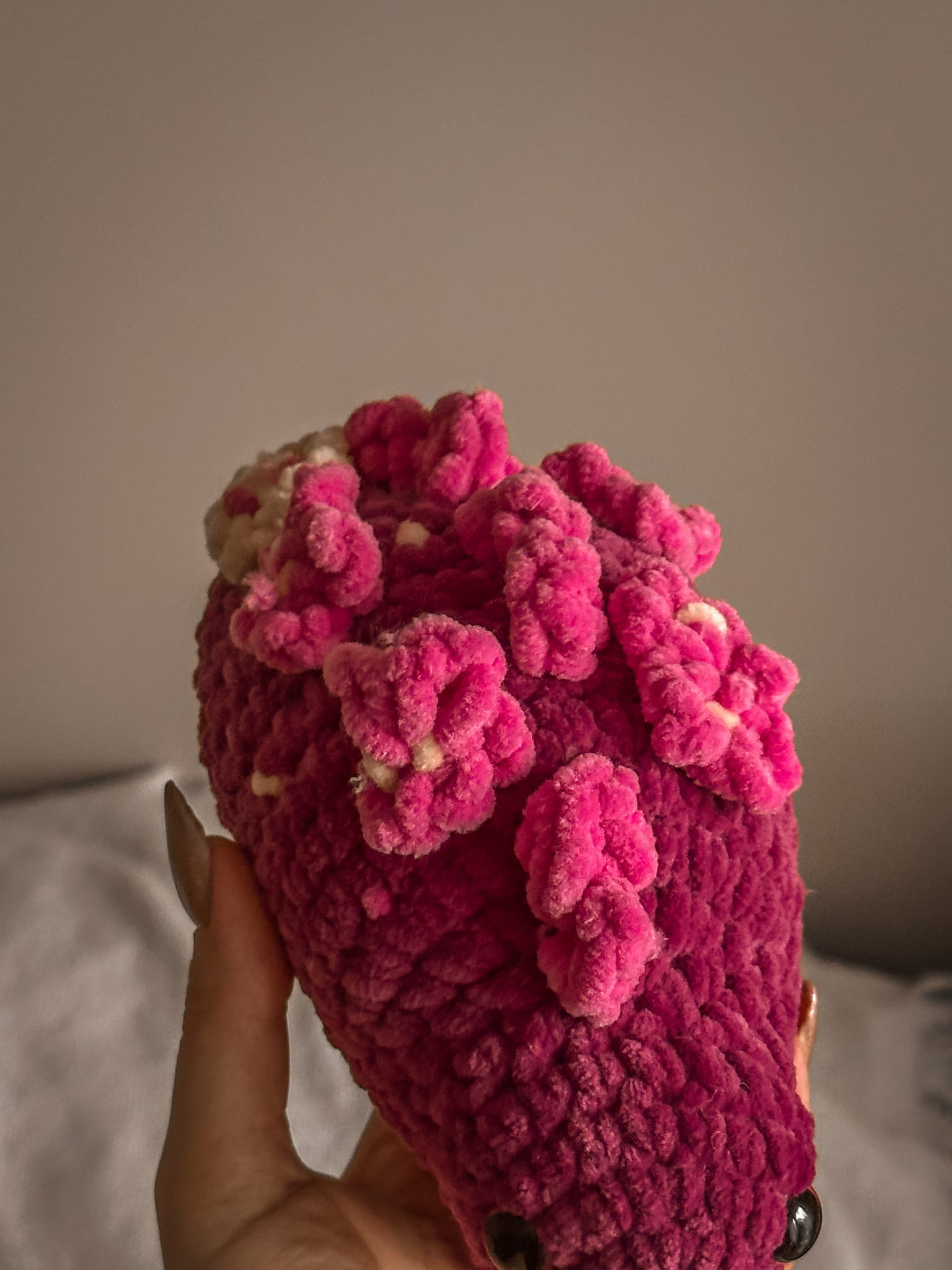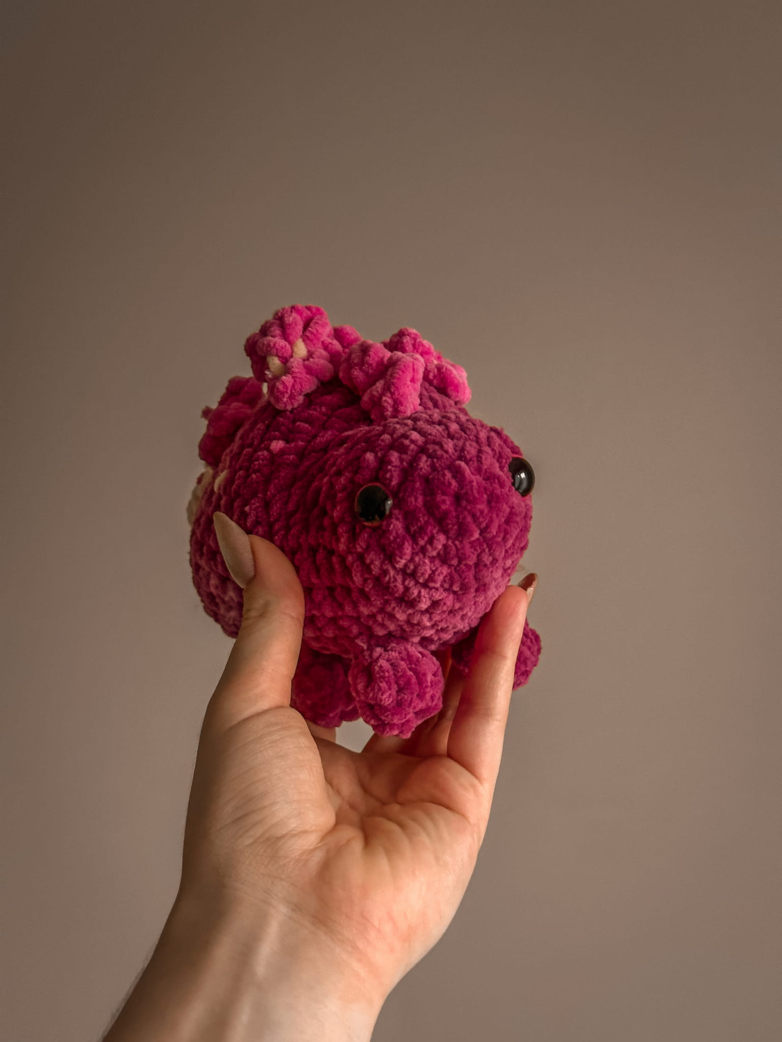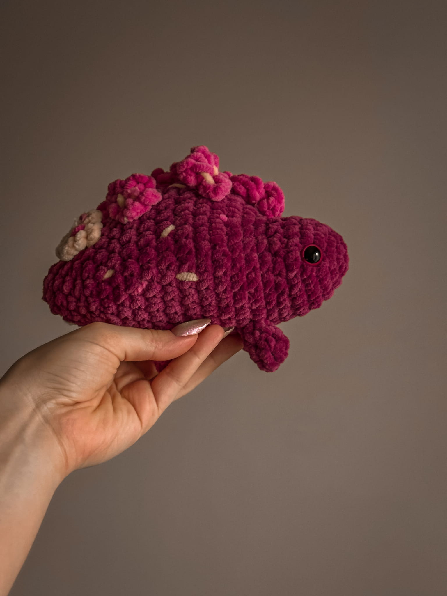 Handmade crochet dinosaur – a unique and adorable companion that will charm anyone! Crafted from soft plush yarn in vibrant shades of pink, this little creature makes a perfect gift for lovers of handmade creations and prehistoric animals.