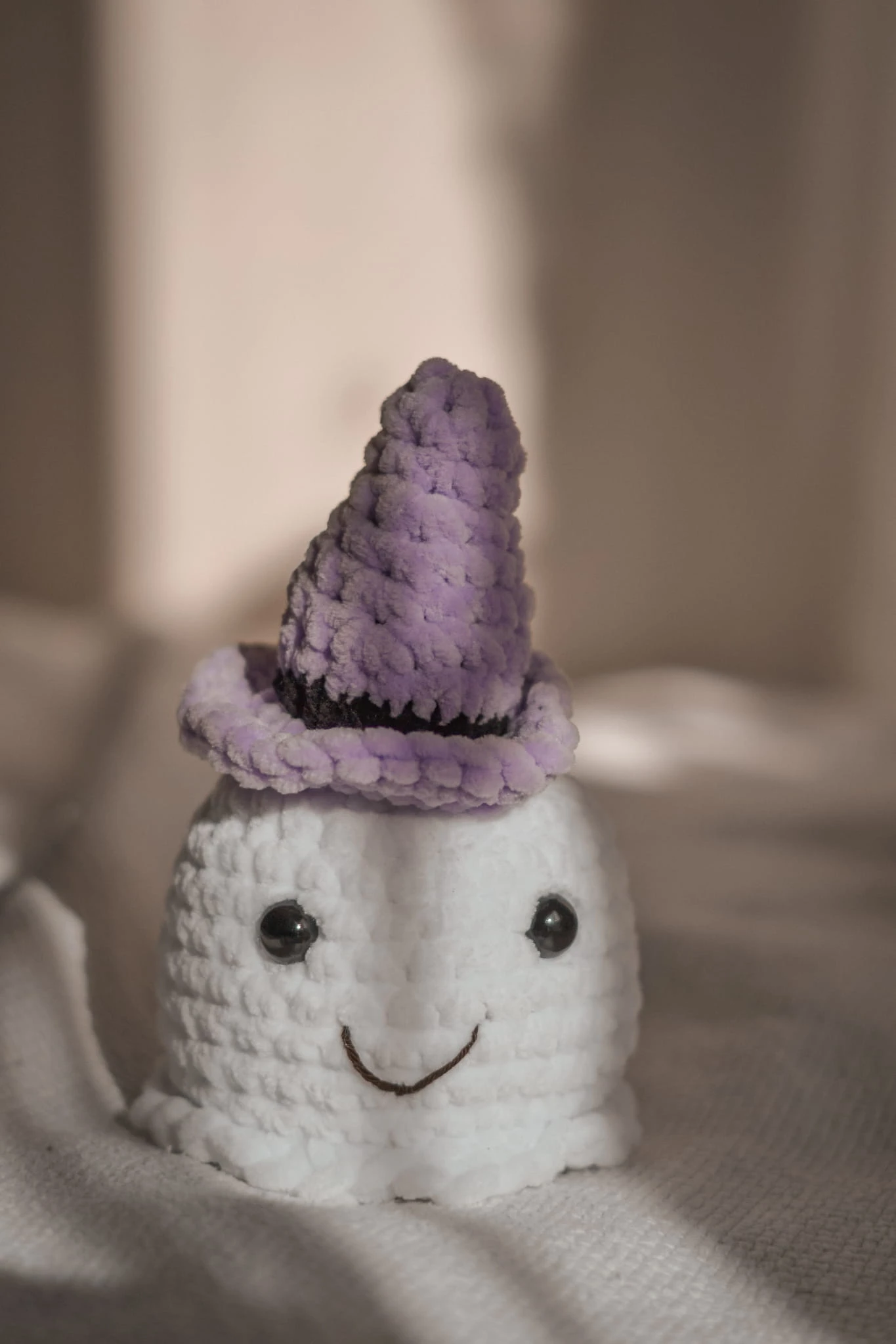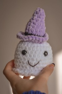 crochet ghost with a purple hat