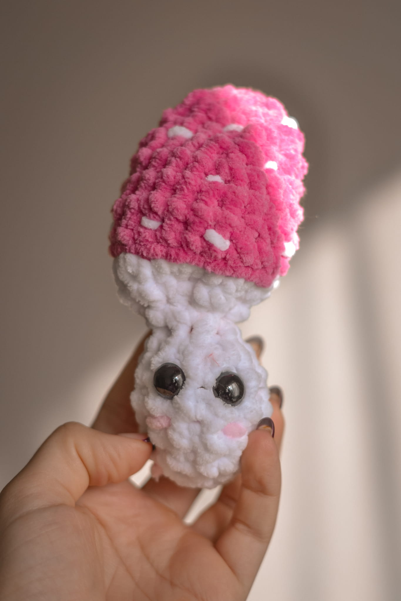 This adorable crochet mushroom is a perfect decorative piece for fans of handmade crafts and unique ornaments. Handcrafted from soft plush yarn, it stands out with its charming appearance and distinctive pink cap with white polka dots. The mushroom is an excellent gift or a delightful addition to any home decor, bringing a cheerful vibe.