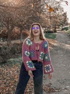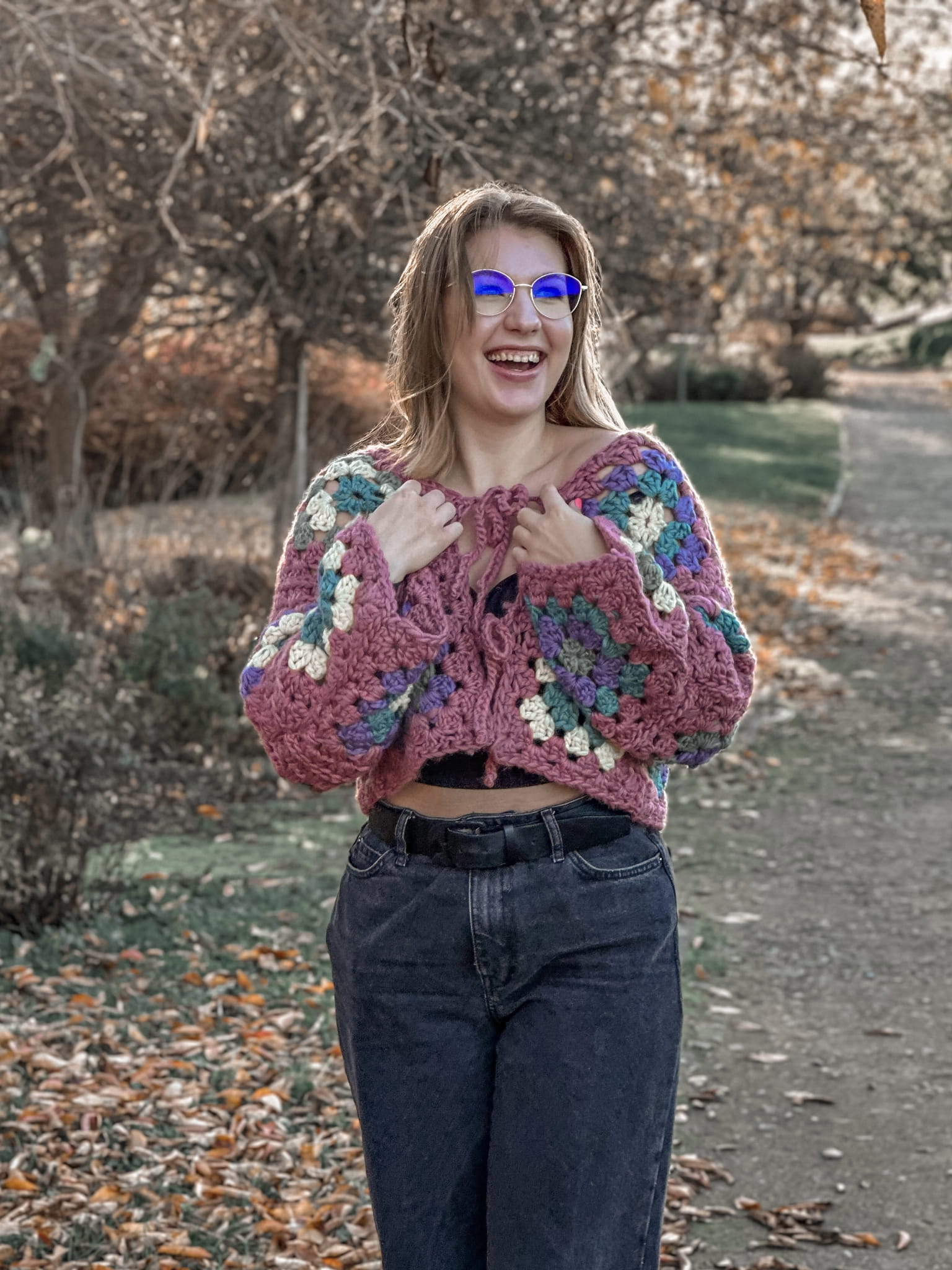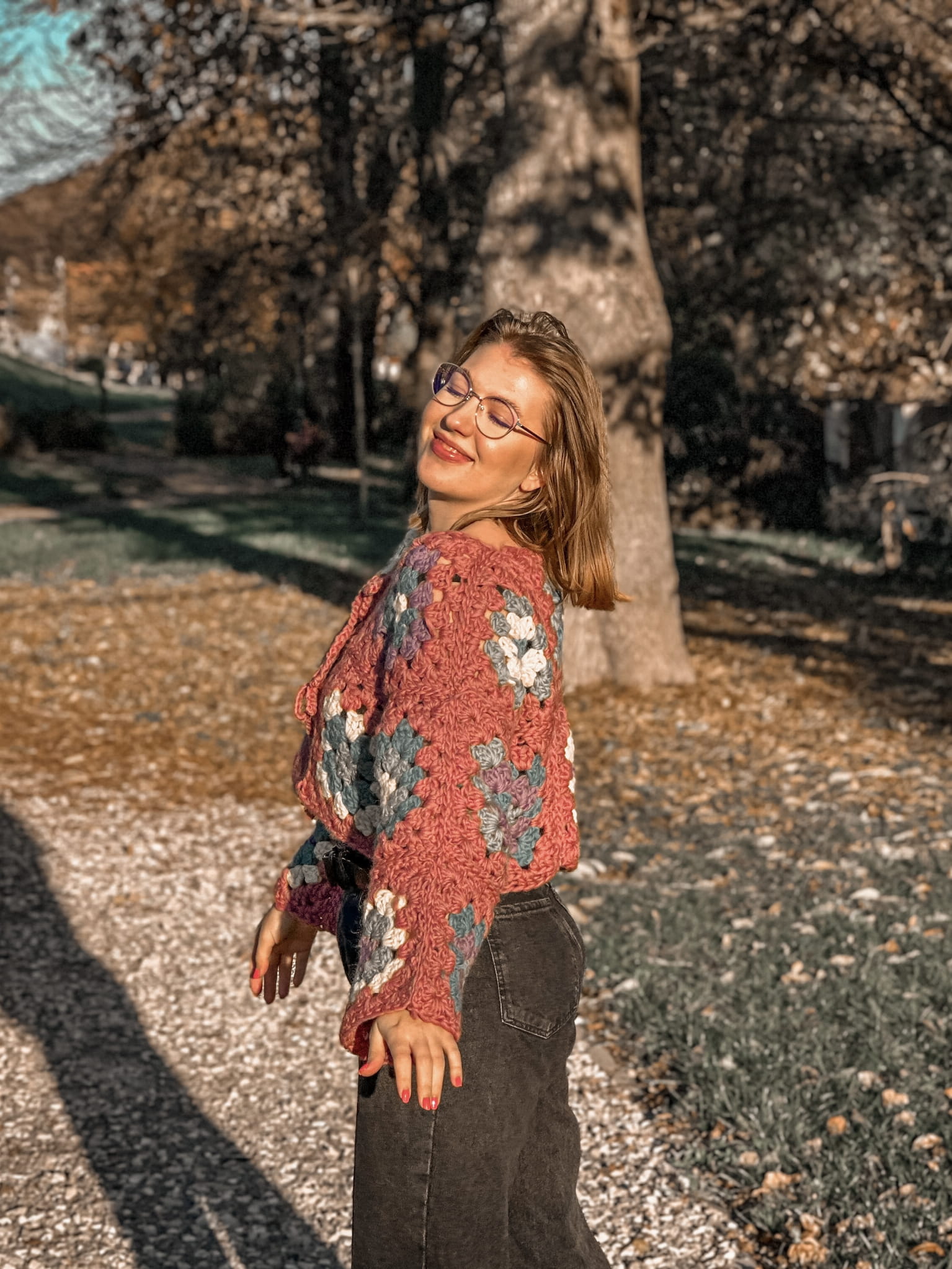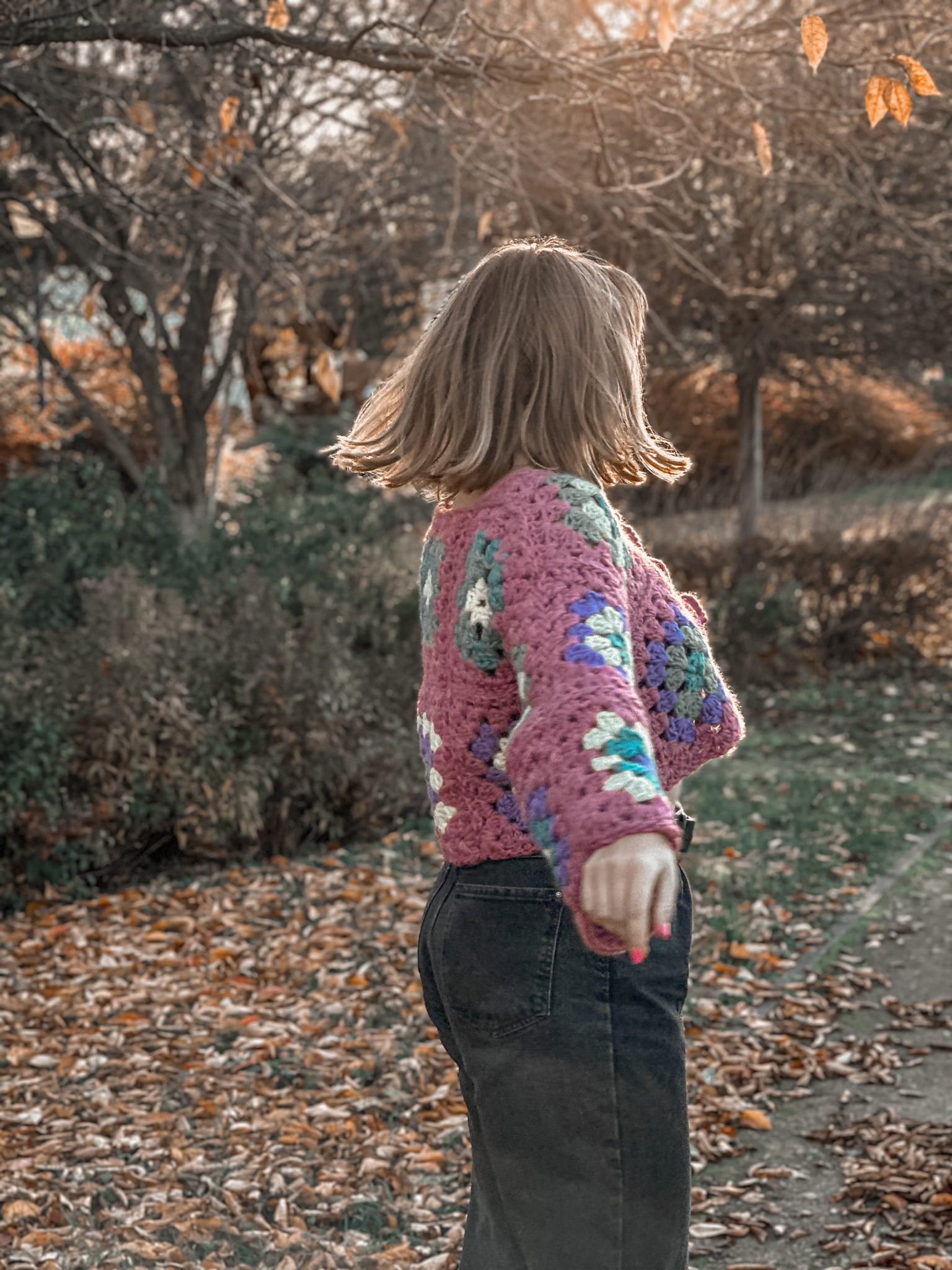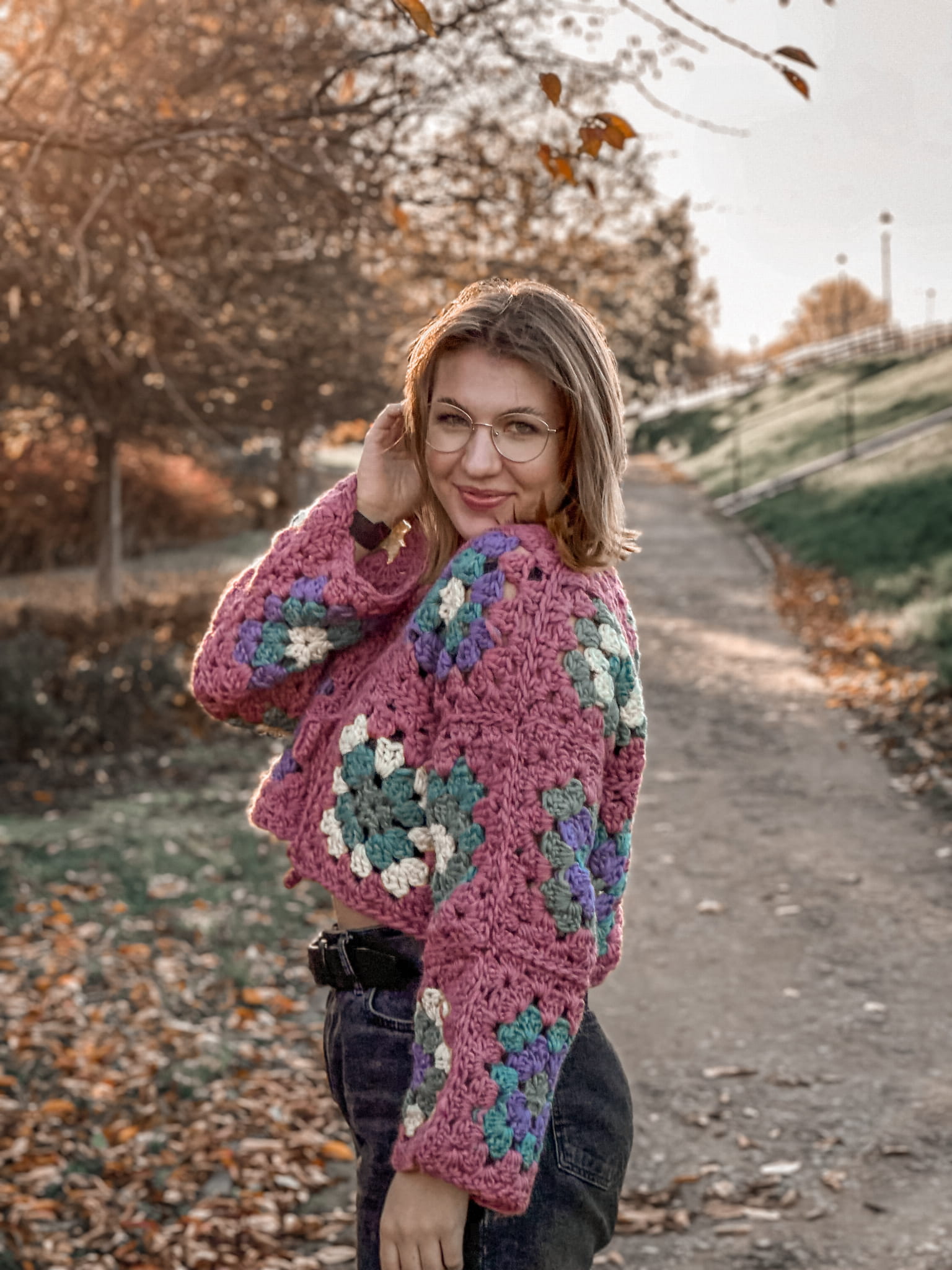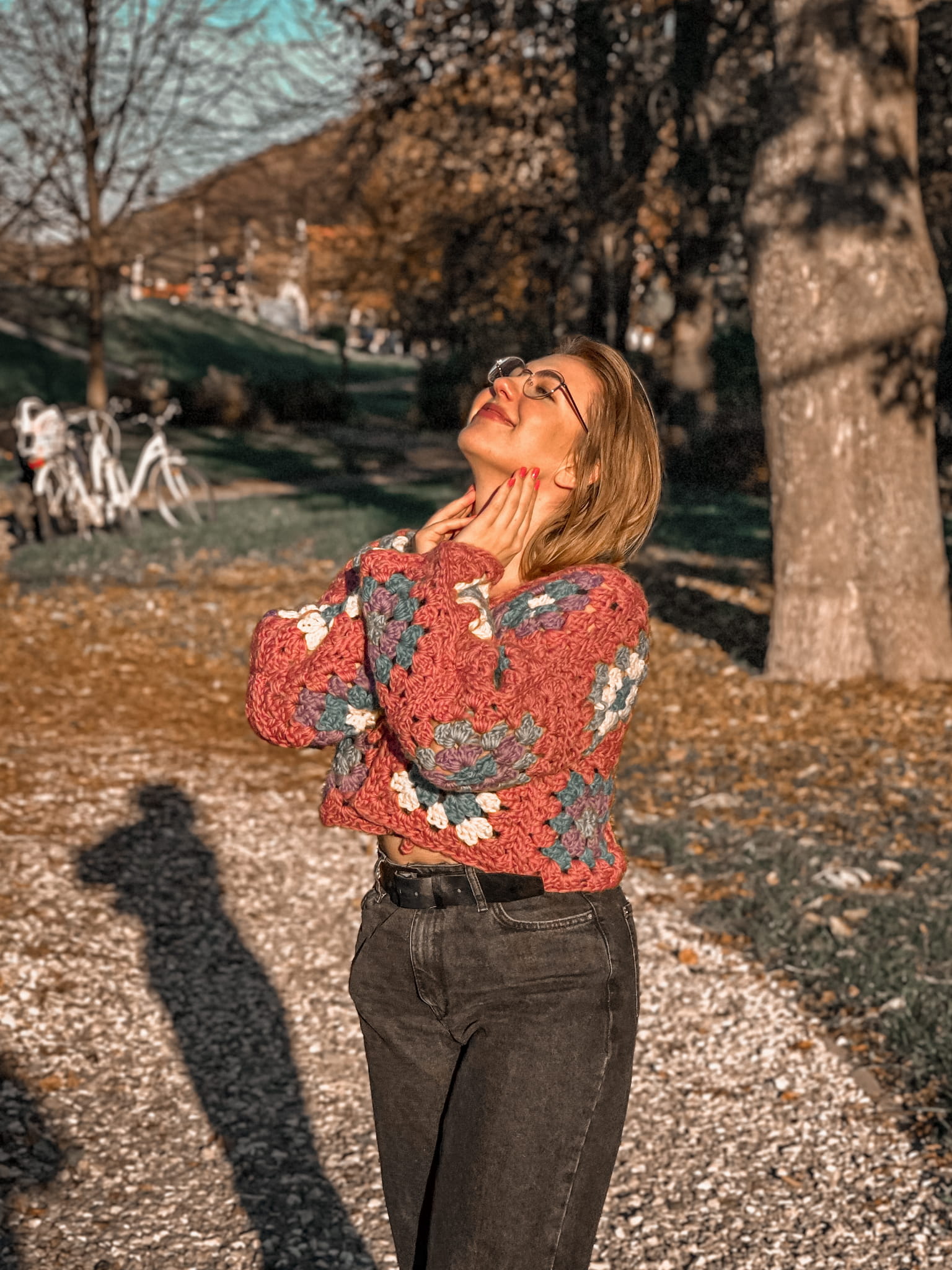 This unique crochet sweater is handmade using the iconic granny squares, giving it a distinctive retro look. Featuring vibrant colors – a pink base with contrasting geometric patterns – it’s the perfect addition to your autumn-winter wardrobe. The cropped fit highlights the silhouette, while the oversized design ensures comfort and style.