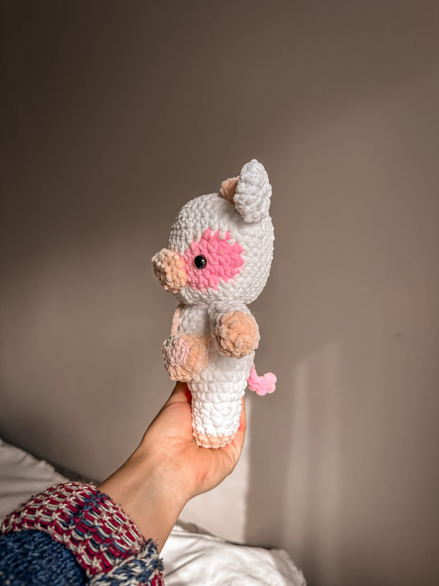 This adorable handmade crochet plush toy in the shape of a pink cow is a perfect choice for lovers of unique, artisanal toys. Made from soft, plush yarn in pastel colors, it is charming and safe for children. The cow features subtle pink accents, characteristic ears, and a small shoulder bag, making it even more special. Ideal as a gift or a decoration for a child’s room.