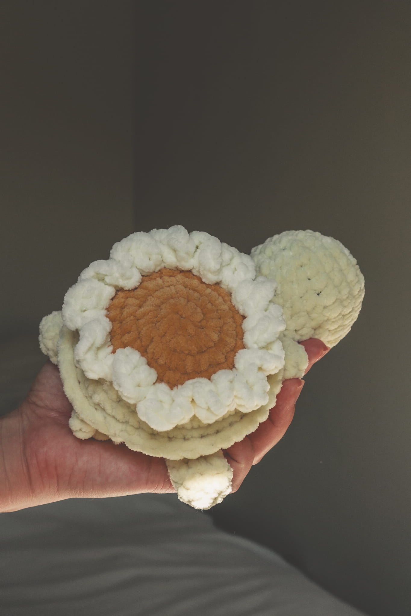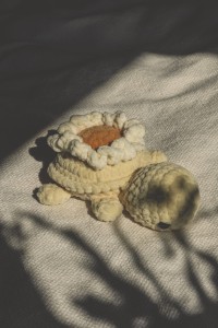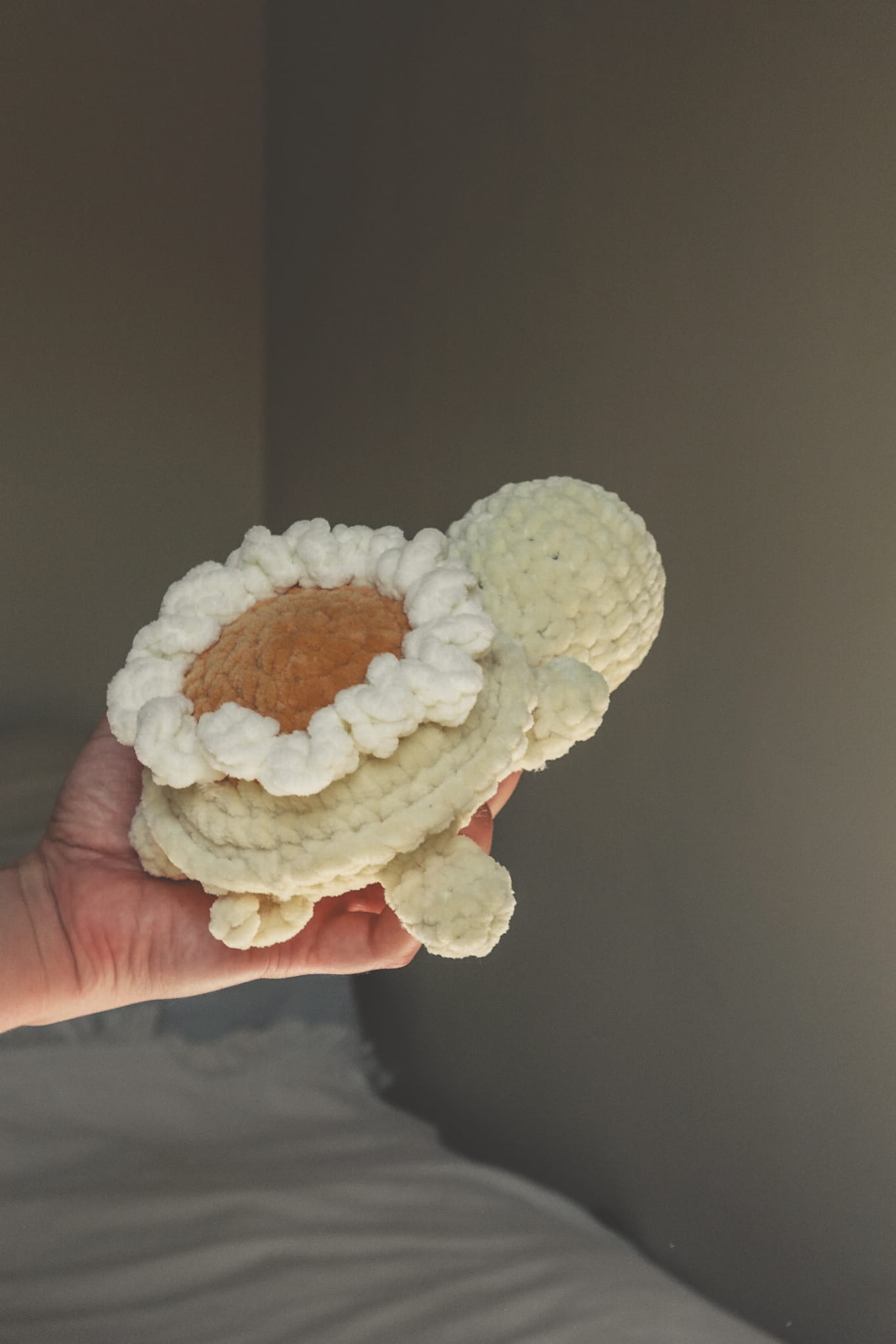 Delikatna, kremowa żółwica z ręcznie szydełkowanym kwiatem na grzbiecie to wyjątkowa maskotka, która łączy urok natury z miękkością przytulanki. Idealna jako prezent, dekoracja pokoju dziecięcego lub towarzyszka codziennych chwil odpoczynku.